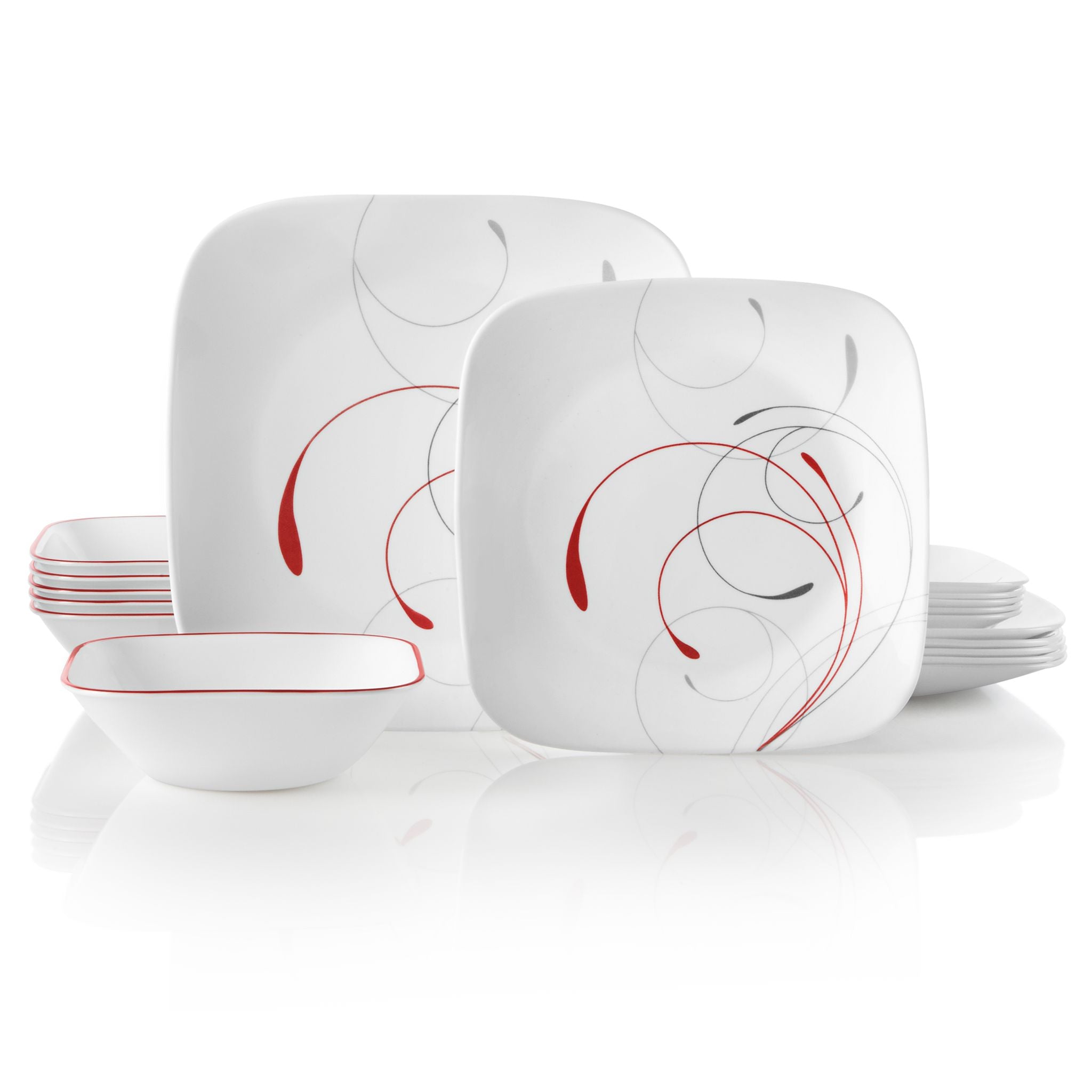 Graceful tendrils of rich red and light gray make a splendid impression on this square dinnerware.